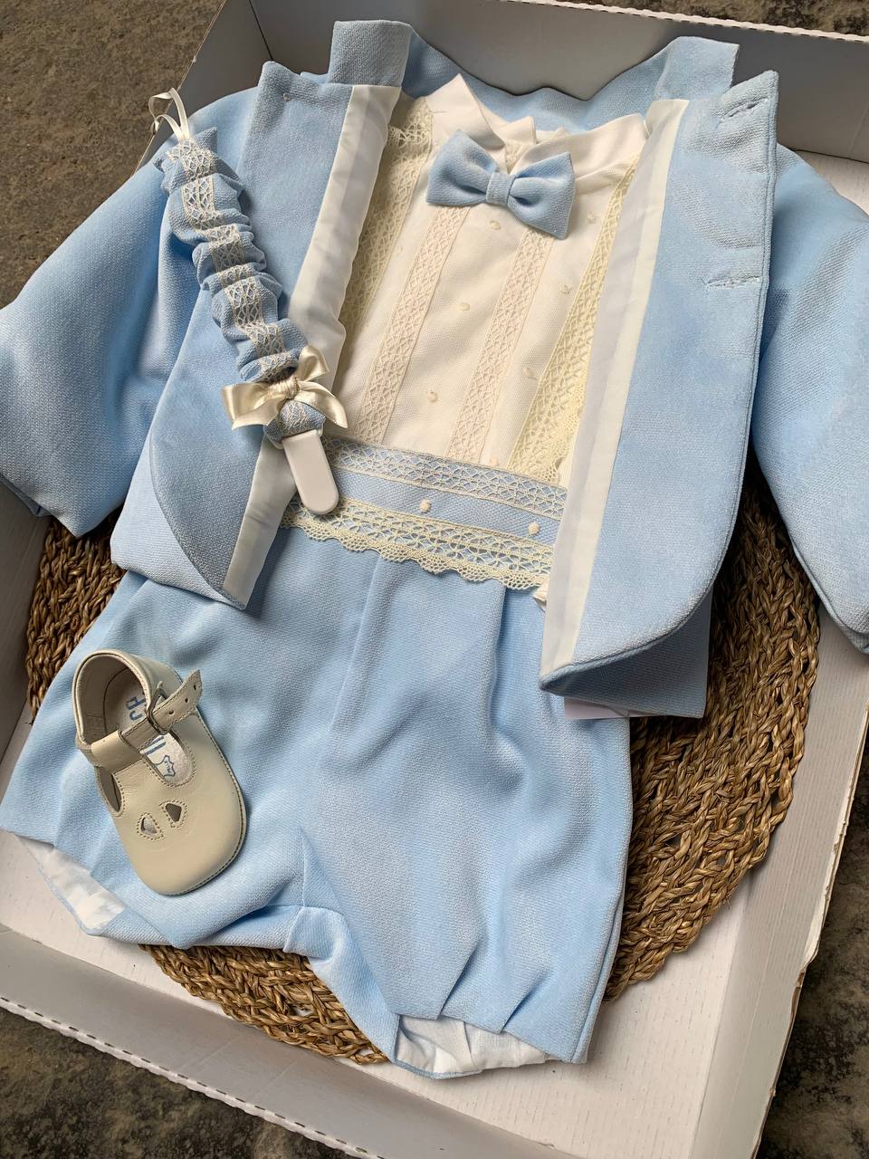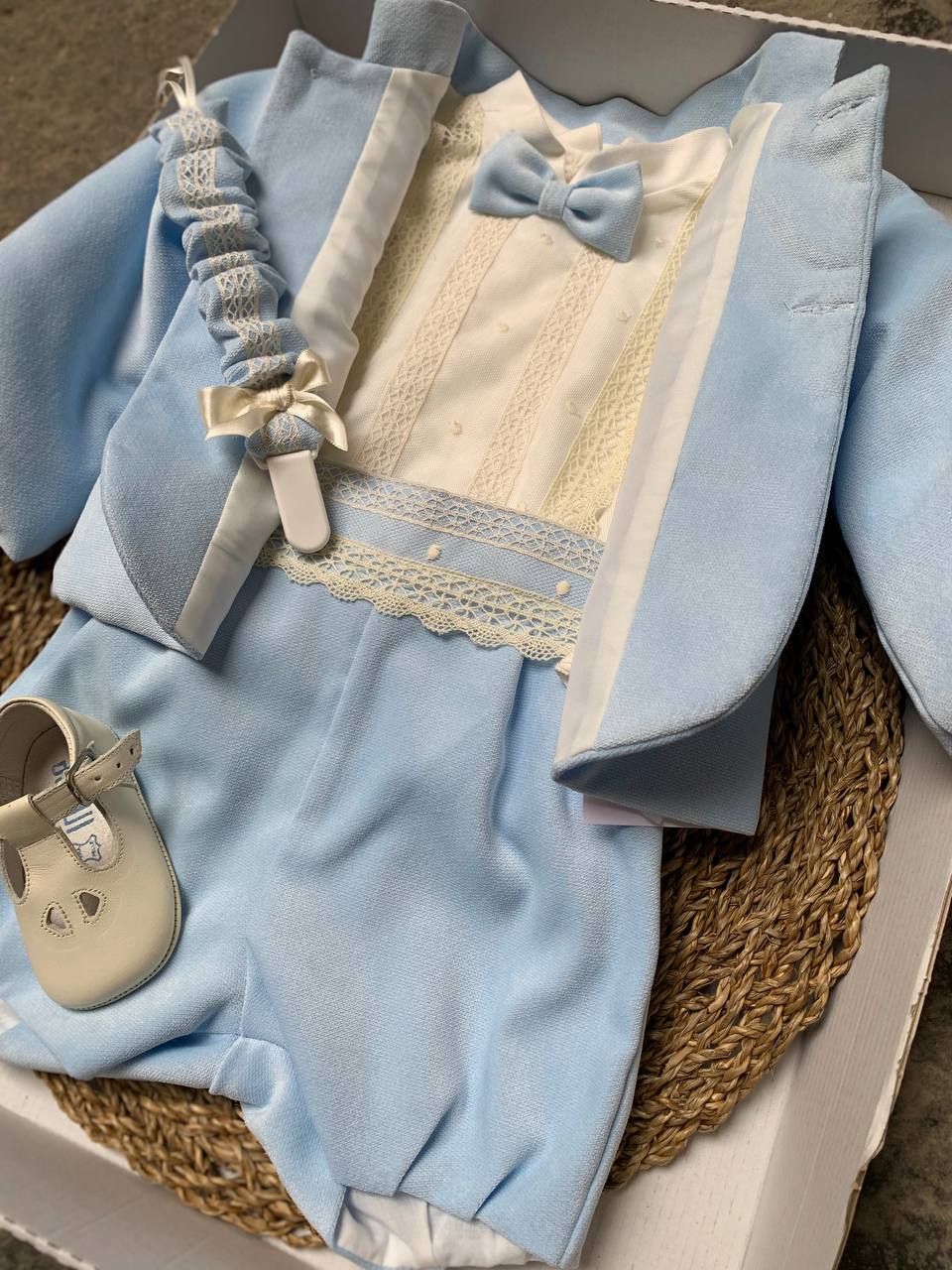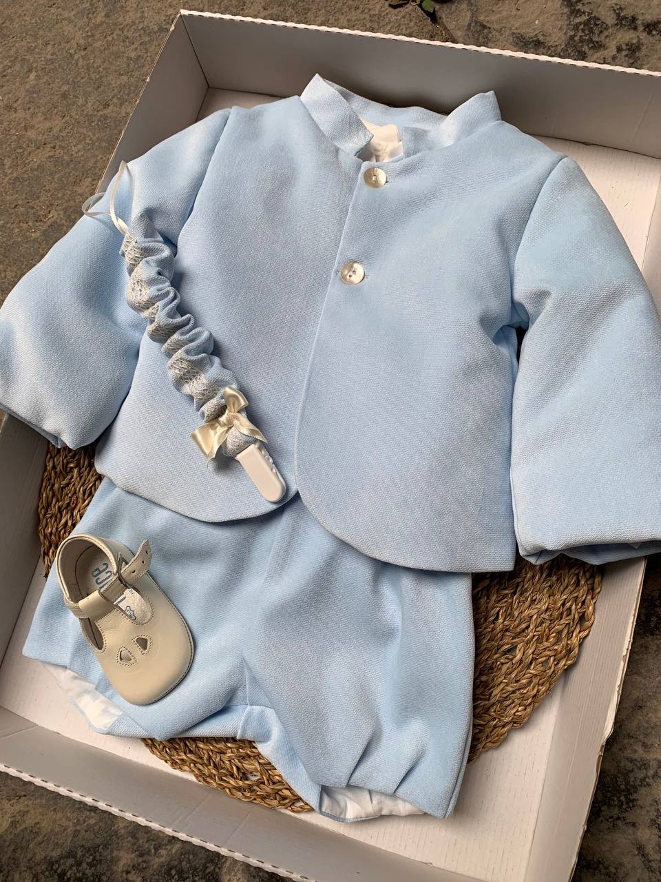 La giacca principe Cielo è l'accessorio perfetto per abbinare al vestito battesimale del tuo neonato. Realizzata con materiali di alta qualità e seguendo uno stile classico e raffinato, questa giacca garantirà al tuo bambino un look elegante e allo stesso tempo confortevole per un'occasione speciale come il suo battesimo.