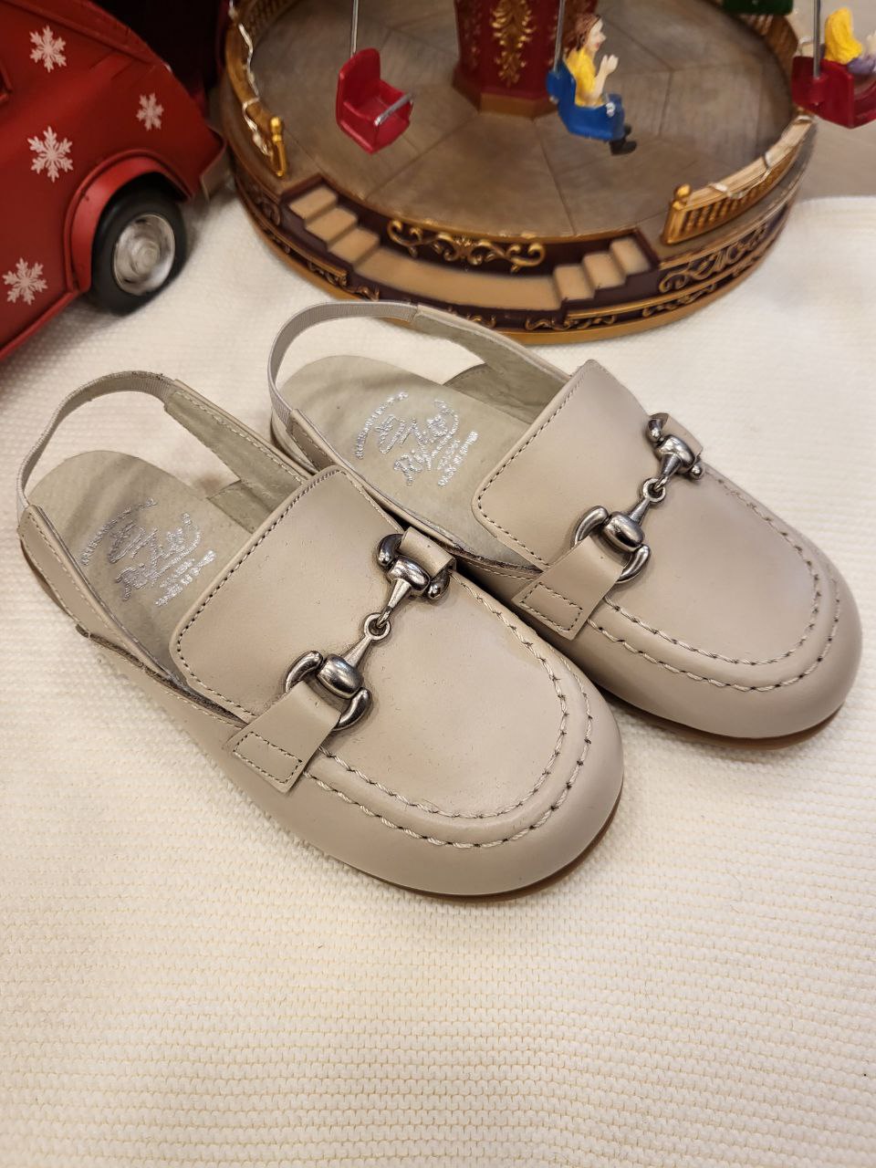 Scarpa mocassino beige Rizitos, perfetto per i primi passi dei tuoi piccoli. Con un design aperto dietro, permette una calzata comoda e facile. Ideale per un look elegante e confortevole.