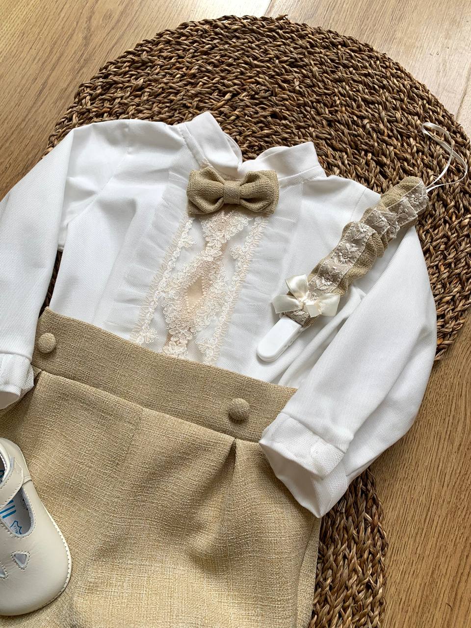Il PORTACIUCCIO principe di Galles è l'accessorio perfetto per il battesimo del tuo neonato. Realizzato in tessuto abbinato al vestito, tiene il ciuccio pulito e al sicuro durante la cerimonia. Aggiungi un tocco di eleganza al look del tuo piccolo principe con questo pratico e raffinato portaciuccio.