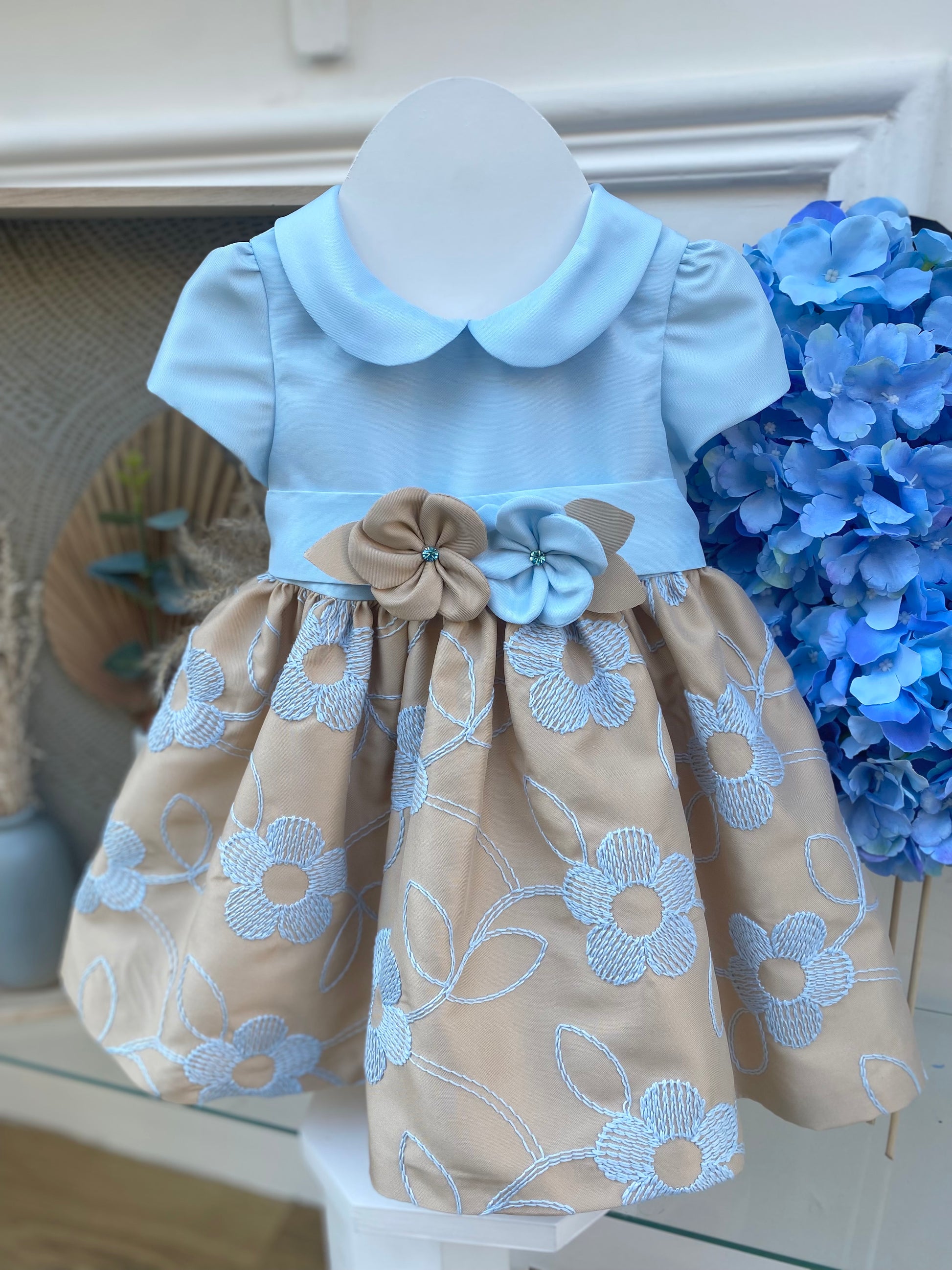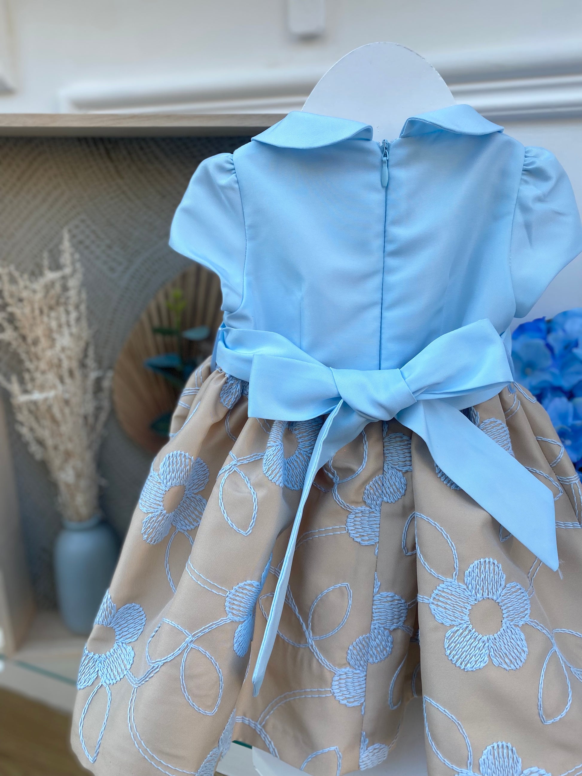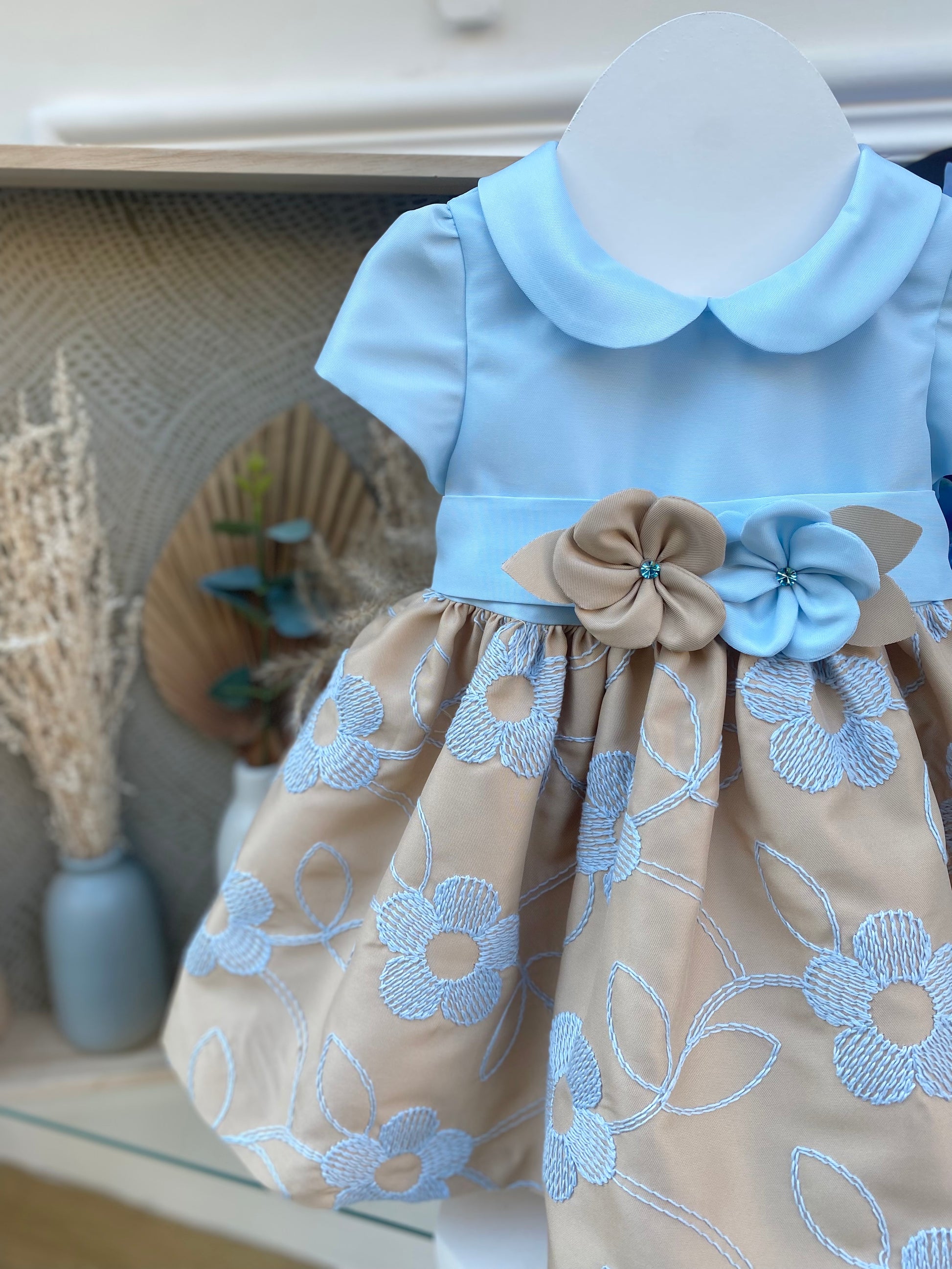 "Immancabilmente primaverile! L'abito fiorellini ha una gonnellina con ricami fiori che per la tua bimba sarà un tocco di freschezza e allegra eleganza. La cinta in vita presenta una spilla con degli strass sul fiore e un fiocco nel retro.