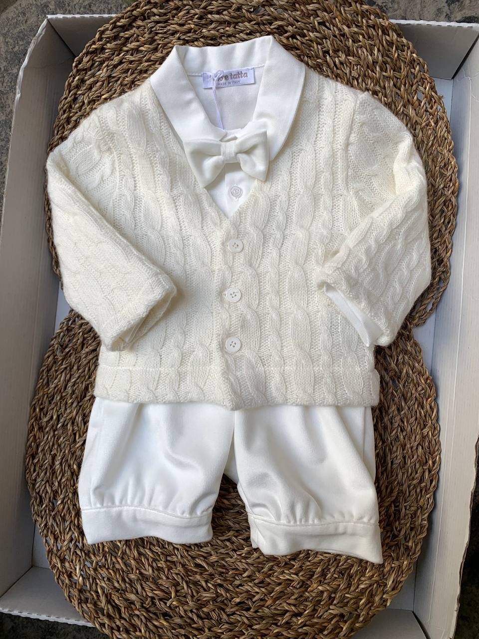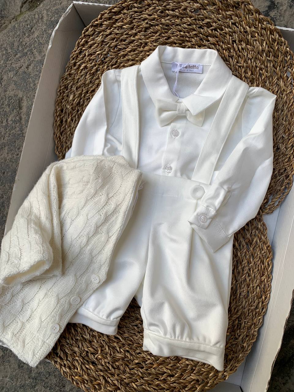 Completo panna comprensivo di salopette, camicia, papillon e coppola abbinata per il tuo bambino. Con il suo design classico e elegante, questo completo è perfetto per occasioni speciali. Realizzato con materiali di alta qualità , garantisce il massimo comfort e stile per il tuo piccolo.