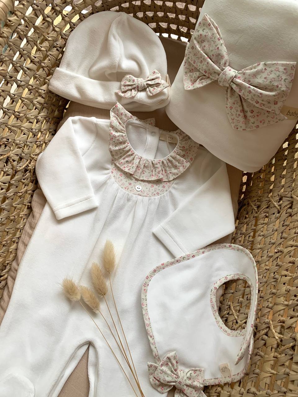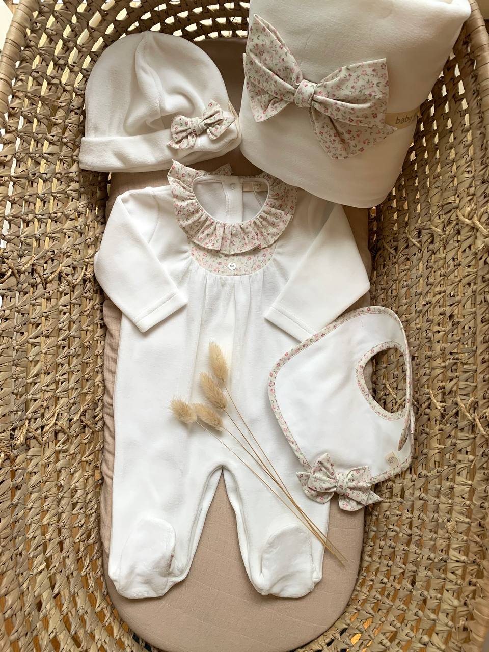 Esclusivo coordinato per neonata in morbida ciniglia, composto da tutina, copertina, bavaglino e cappellino. Garantisce un perfetto abbinamento e massimo comfort alla tua piccola. Ideale per mantenere il tuo bebè al caldo e protetto. Un must-have per ogni neonata.