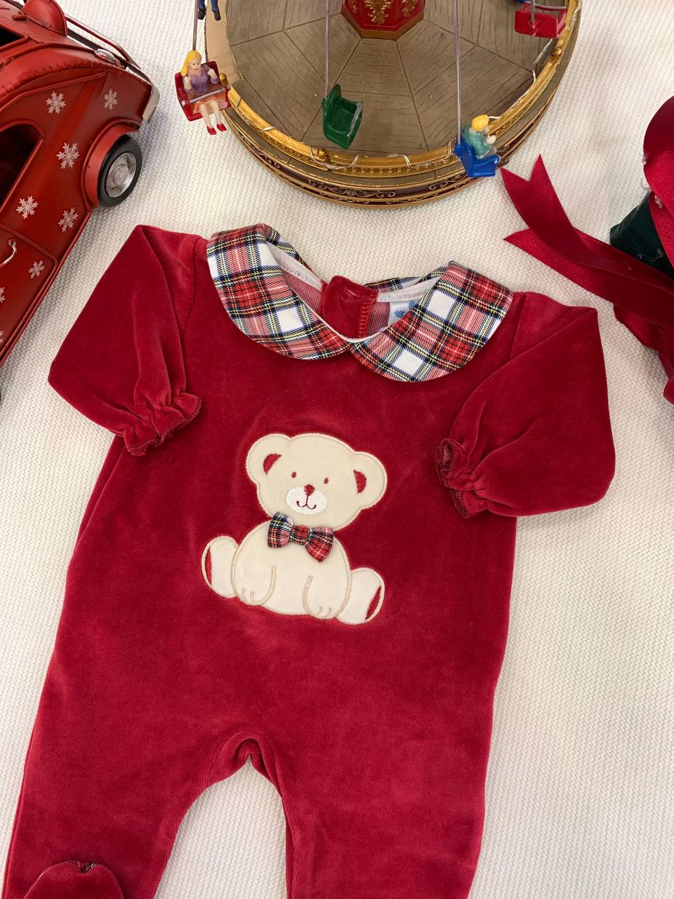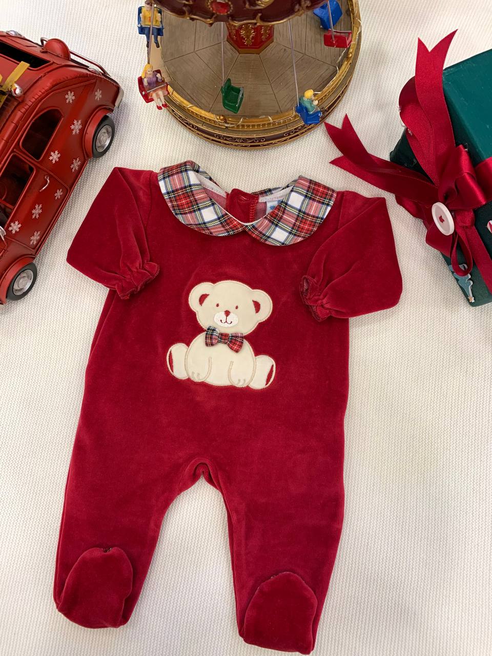Tutina intera di ciniglia con collo scozzese e un tenero orsetto