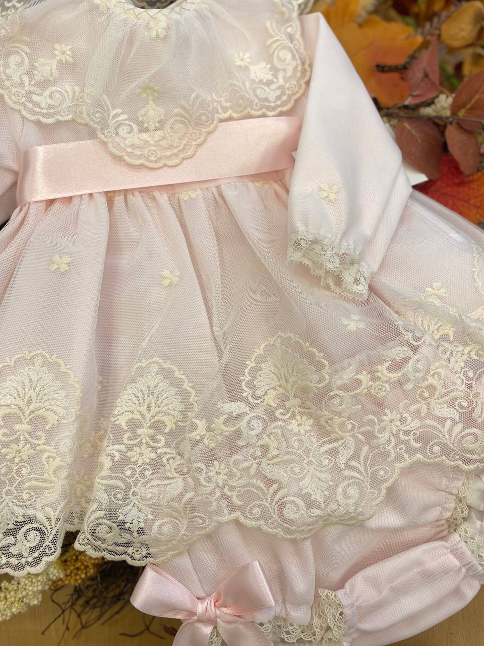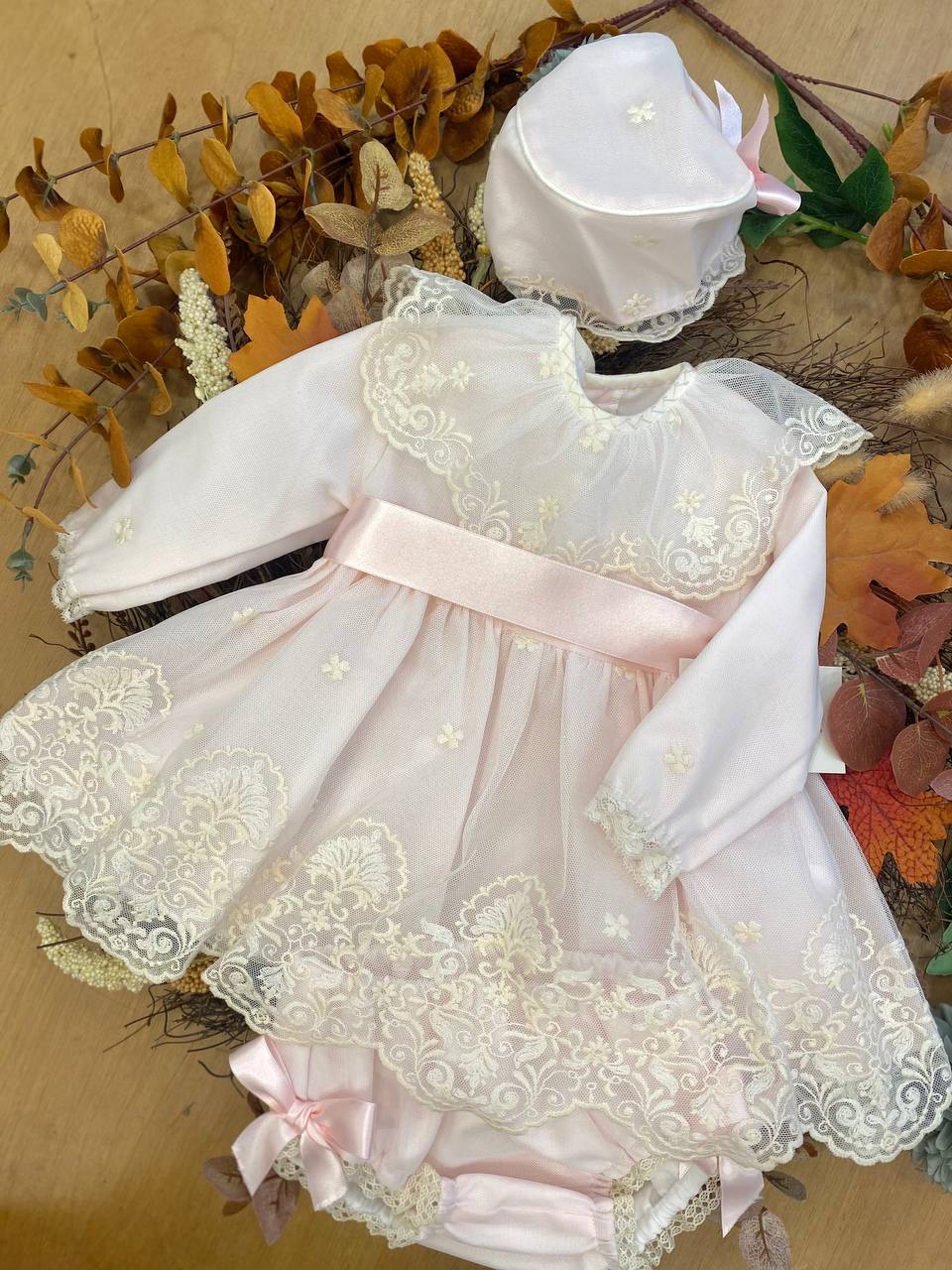 Bellissimo abito di Mimosines con ricami di alta qualita coordinato con cuffietta e culotte